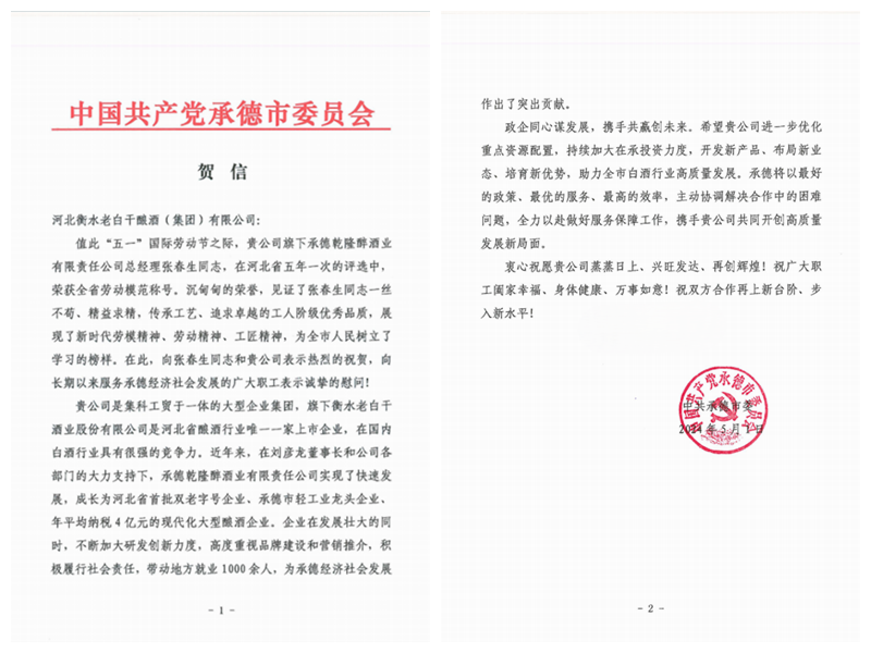 河北衡水老白干釀酒集團收到一封來自承德市委的賀信,賀信主要內容是對河北衡水老白干釀酒集團子公司承德乾隆醉酒業(yè)(板城酒業(yè))黨委書記、總經理張春生榮獲“全省勞動模范”稱號表示祝賀。祝賀信中講到:“張春生同志一絲不茍、精益求精,傳承工藝、追求卓越的工人階級優(yōu)秀品質,展現(xiàn)了新時代勞模精神、勞動精神、工匠精神,為全市人民樹立了榜樣,近年來,企業(yè)在發(fā)展壯大的同時,不斷加大研發(fā)創(chuàng)新力度,高度重視品牌建設和營銷推介,積極履行社會責任,帶動地方就業(yè)1000余人,為承德經濟社會發(fā)展作出了突出貢獻。”張春生作為制造業(yè)(工業(yè)領域)的翹楚,先后獲省“三三三人才工程”人選、河北省企業(yè)家協(xié)會先進工作者、河北省食品行業(yè)年度人物、中國商業(yè)聯(lián)合會科學技術獎、全國商業(yè)科技進步獎-特等獎、2020年與2022年度分別榮獲河北省優(yōu)秀民營企業(yè)家等多項榮譽。