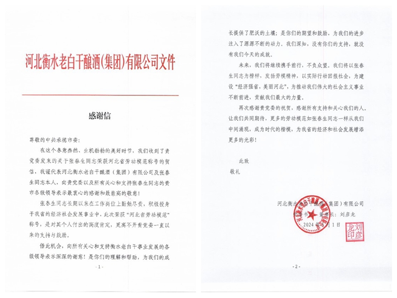 河北老白干釀酒集團在感謝信中寫到:“張春生同志長期以來在工作崗位上勤勉盡責,積極投身于我省的經濟社會發(fā)展事業(yè)之中,此次榮獲河北省勞動模范,是對其個人付出的高度肯定,更離不開承德市黨委一直以來的支持與鼓勵。我們將以張春生同志為榜樣,發(fā)揚勞模精神,以實際行動回報社會,為建設經濟強省,美麗河北,貢獻我們最大的力量”。
